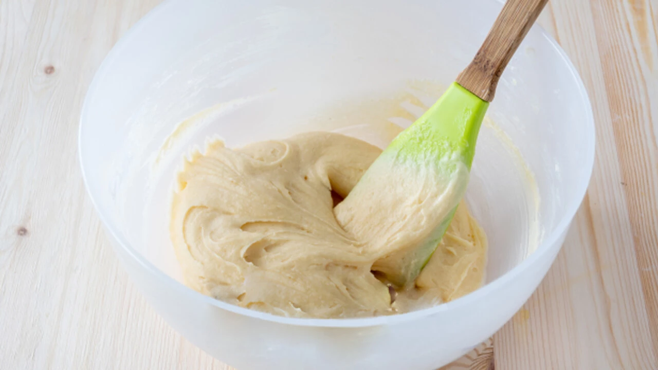 Add two eggs and beat until the mixture becomes homogeneous. Then add flour and baking powder. Knead the dough. Its consistency is like a cream.